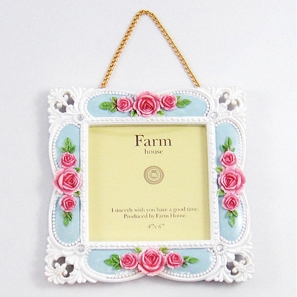 デコラティブなホワイト×ベビーブルーのフレームにピンクローズのついたロマンチックなチェーン付きの壁掛けフォトフレーム。